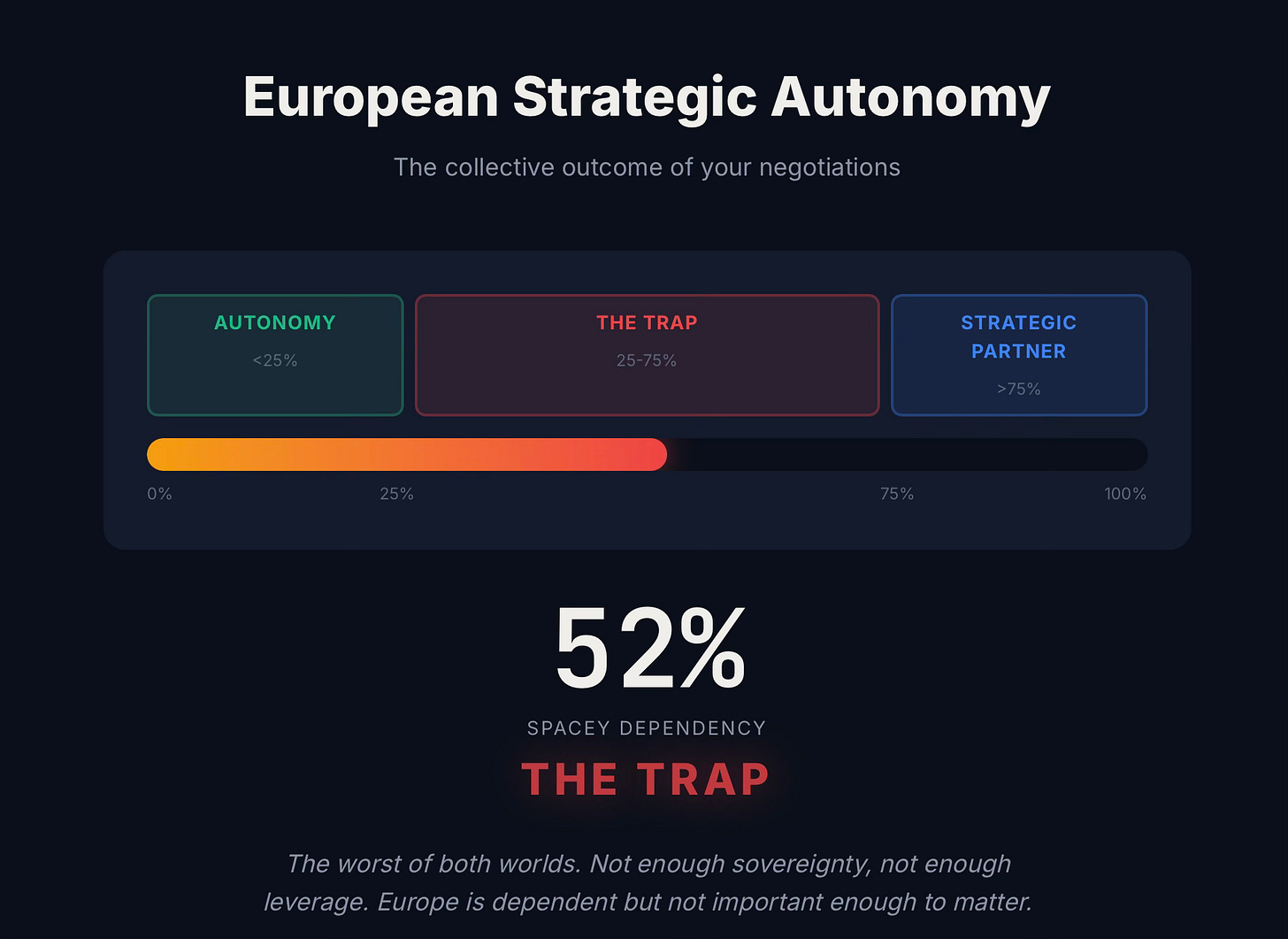 We had a lot of fun last night beta-testing Laurence Pevsner’s new game Dead Reckoning. As Yuma Kim wrote last week, it explores Europe’s space trilemma between dependency, capability and jobs. How did dozens of players perform extracting Europe from its dependency trap? Well, pretty much perfectly terribly!